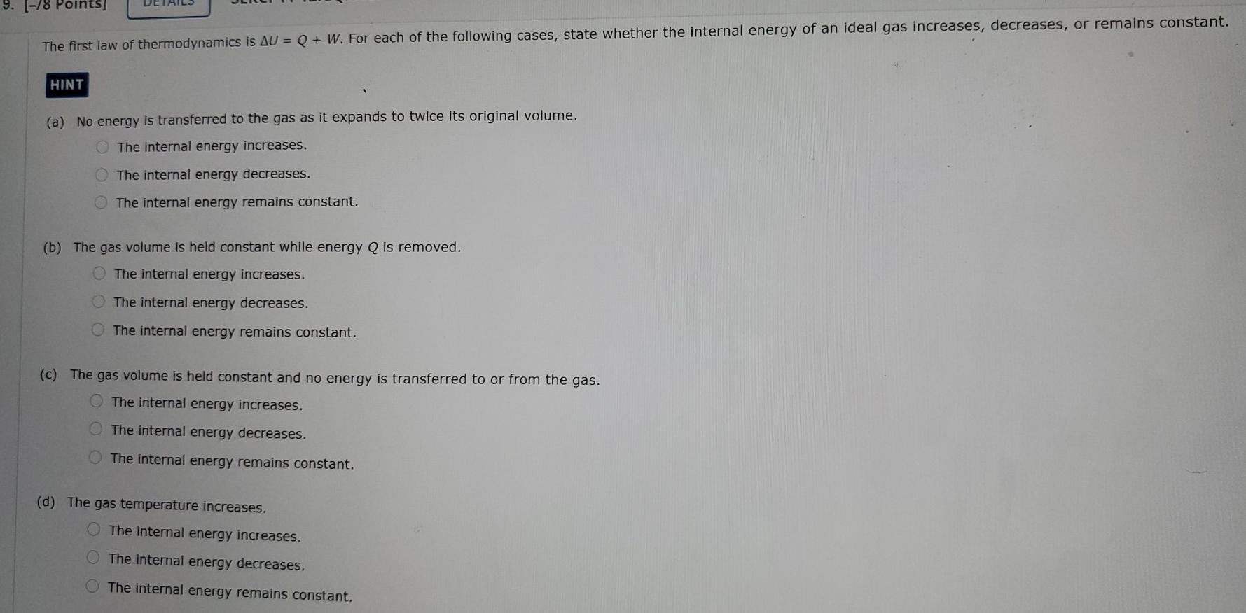 *Solved 9. [-78 Points The first law of thermodynamics is AU *
