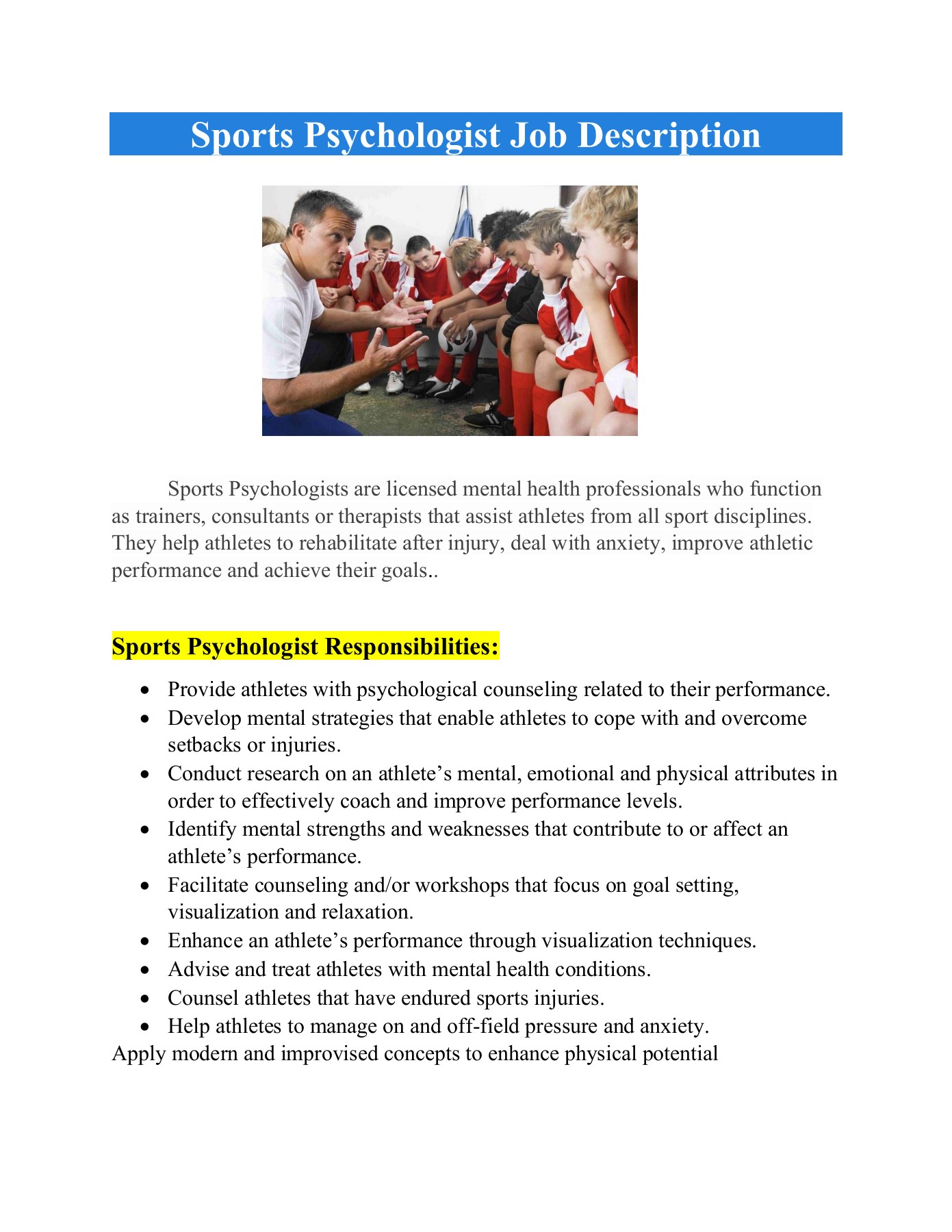 Careers With a Sports Psychology Degree | Sports Psychology Jobs. Career Paths in Sports Psychology · Certified Mental Performance Consultant When athletes want to gain a competitive edge, they often turn to certified mental , Sports Psychologist Job Description - kittiwat namwong - Page 1 , Sports Psychologist Job Description - kittiwat namwong - Page 1. Best Methods for Leading job posting for sports psychologists and related matters.